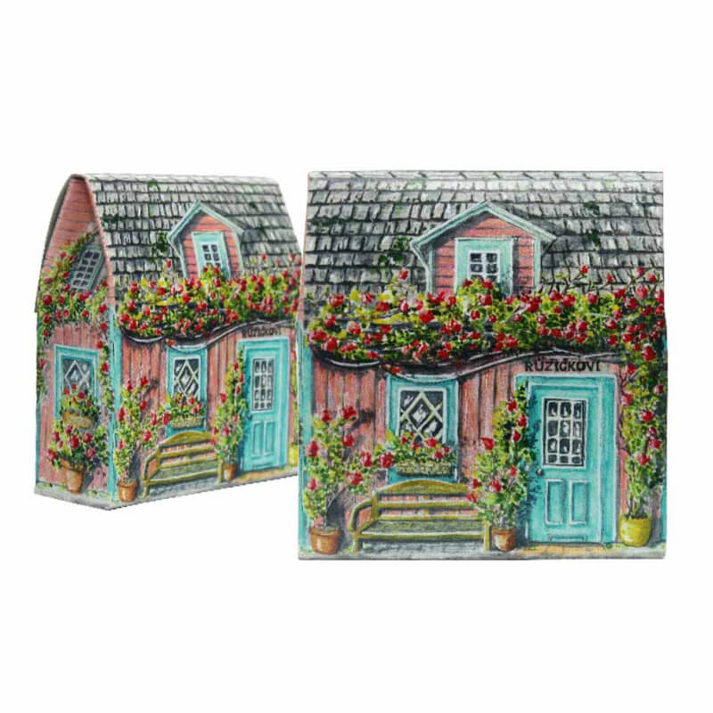 Romantický Mýdlový růžičkový domek • tuhé mýdlo 80 g s jemnou květinovou vůní růže. Zabalené v papírové krabičce s ručně malovaným domečkem, které potěší jako dárek i voňavá dekorace.