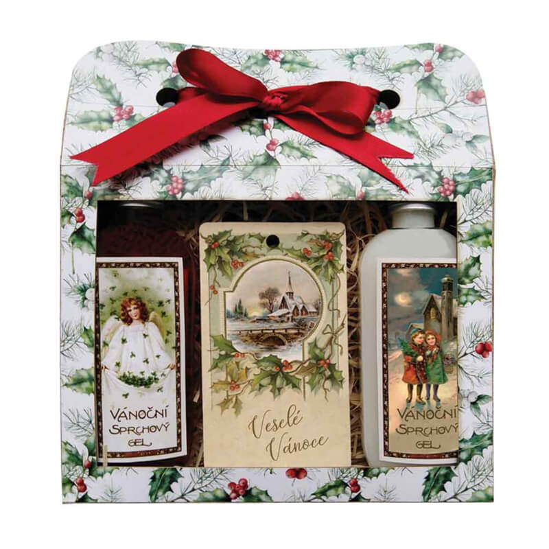 Vánoční kosmetická sada s vůní jablka a skořice. Olejový sprchový gel s olivovým a hroznovým olejem, extraktem z bylin a vůní jablka a skořice 100 ml Kombinace jemných mycích složek s eudermickými oleji z olivy (Olea europaea) a hroznů vinné révy (Vitis vinifera) zajišťuje účinné a šetrné umytí, ošetření a zamezení nadměrnému vysušování pokožky. Krémový sprchový gel s vůní jablka a skořice 100 ml Jemný prostředek osobní hygieny vhodný pro mytí celého těla. Obsahuje kvalitní kosmetický olivový olej s osvědčenou směsí extraktů z kopřivy dvoudomé (Urtica dioica), heřmánku pravého (Chamomilla recutita), břízy bílé (Betula alba), měsíčku lékařského (Calendula officinalis) a šalvěje lékařské (Salvia officinalis). Tyto extrakty v kombinaci s dalšími ošetřujícími složkami napomáhají ochraně před nadměrným vysušováním a podrážděním pokožky při mytí a jejímu udržování v hebkém a jemném stavu. Ručně parfémovaná aromatická karta s motivem Vánoc Jemná a čistá vůně, která probouzí emoce a vzpomínky.